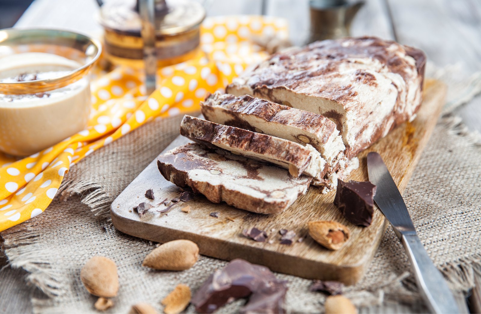 Αμύγδαλα και κουβερτούρα! Δύο εκλεκτά υλικά που μοιάζουν πλασμένα το ένα για το άλλο. Μια ιδιαίτερη και ιδιαιτέρως θρεπτική πρόταση χαλβά, που προκαλεί έρωτα στην πρώτη μπουκιά!